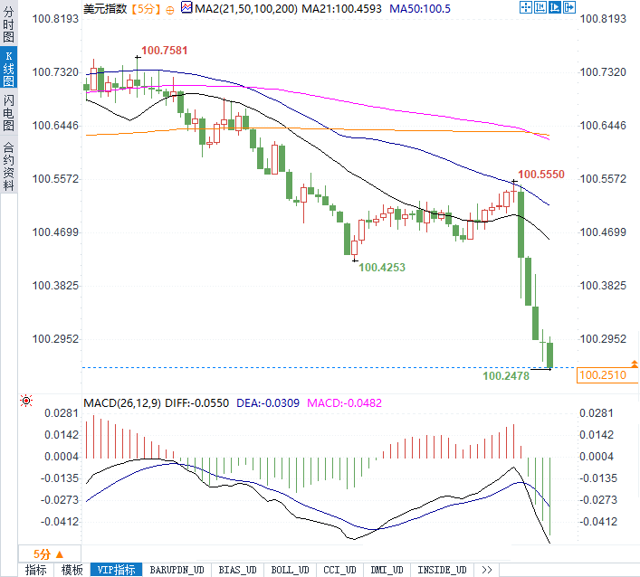 美元指数短线下挫17点,跌至100.39,显示出市场对美元的看空情绪。而
