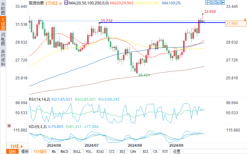 现货白银报31.959美元/盎司,跌幅0.11%。