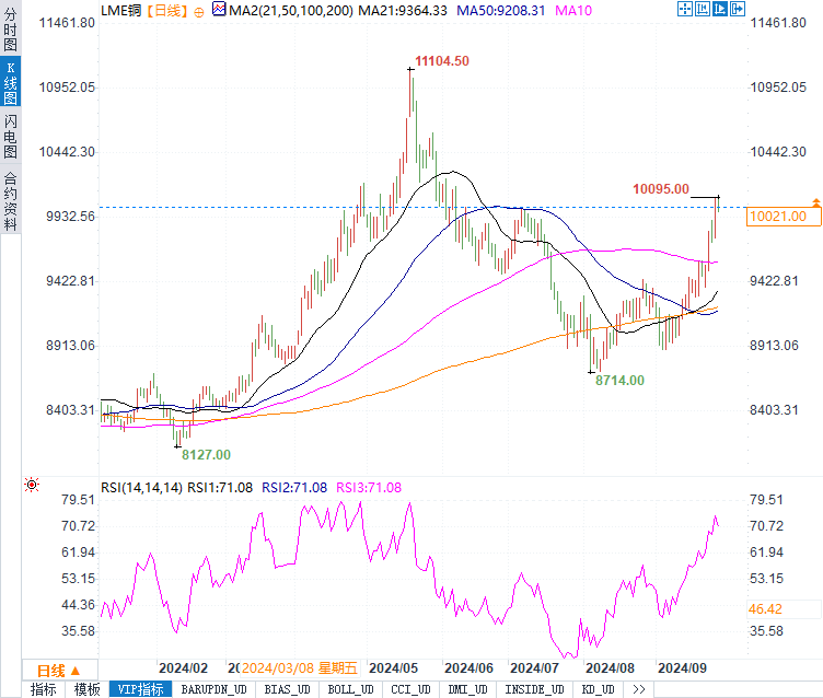 汇通财经APP讯——近期,铜价受到中国刺激政策的带动,市场情绪明显回暖。伦敦金属交易所(LME)三个月期铜价格曾突破每吨10000美元的关键心理阻力位,显示出市场对中国经济信心增强。然而,美联储最新政策方向与全球经济的不确定性依然是主导市场动向的关键因素。本文将从铜价最新的反弹走势、背后的基本面和技术面逻辑入手,分析铜市场未来的风险与机遇。