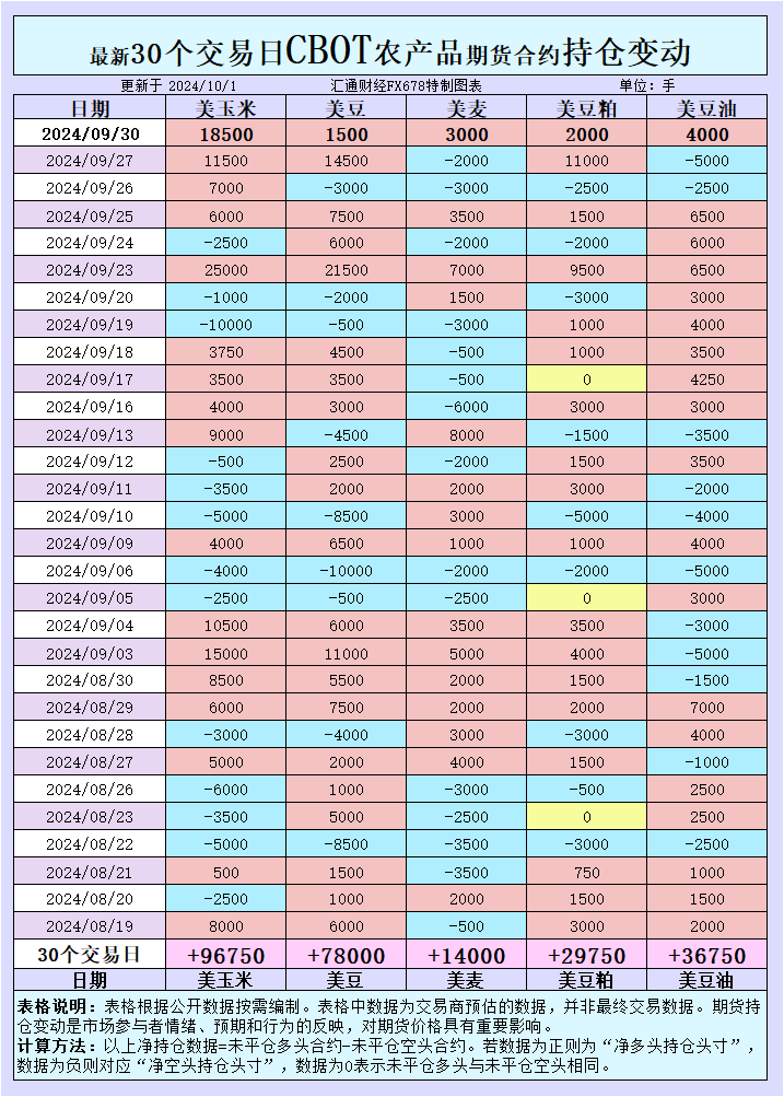 汇通财经APP讯——周二(10月1日),市场聚焦昨日(9月30日)发布的持仓数据,大宗商品基金加码玉米、大豆、小麦等农产品的净多头头寸,反映出投资者对后市的看涨情绪。与此同时,河流运输条件改善、出口需求变化等因素也对现货和期货价格产生了显著影响。本文将通过最新的期货收盘价、基差以及市场消息,深入分析各品种的行情变化及未来走势。