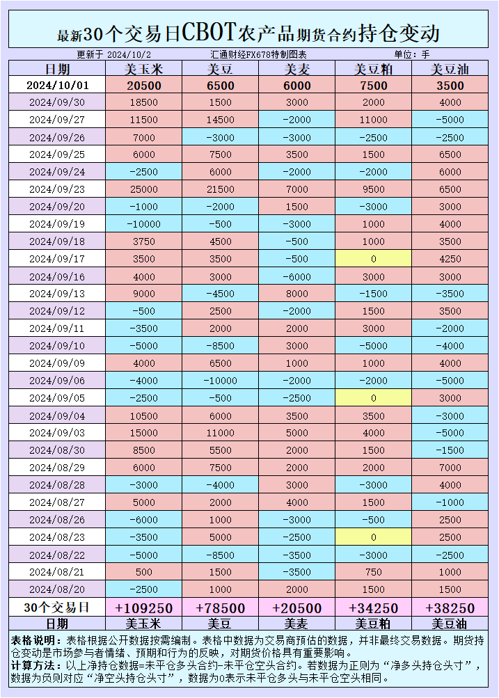 增加CBOT玉米投机性净多头;增加CBOT大豆投机性净多头;增加CBOT小麦投机性净多头;增加CBOT豆粕投机性净多头;增加CBOT豆油投机性净多头。