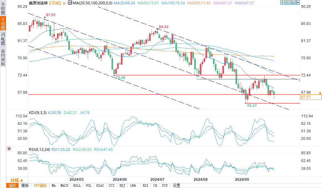 油价跌破7月份以来的下跌趋势线。近期从65.25(9月低点)反弹,未能重新夺回71.50 - 72.50阻力区,并反弹至低位。
