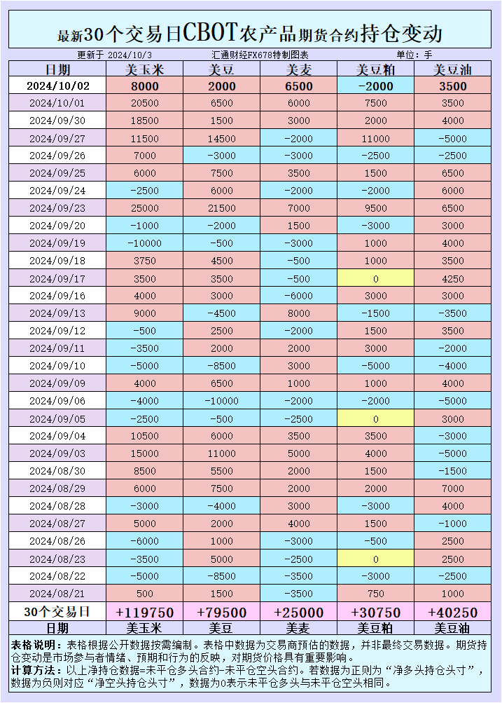 增加CBOT玉米投机性净多头;增加CBOT大豆投机性净多头;增加CBOT小麦投机性净多头;增加CBOT豆粕投机性净空头;增加CBOT豆油投机性净多头。