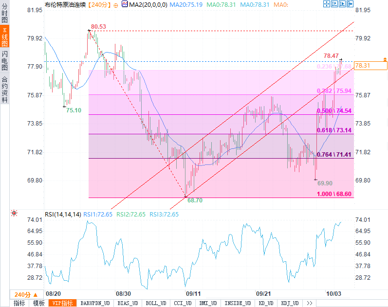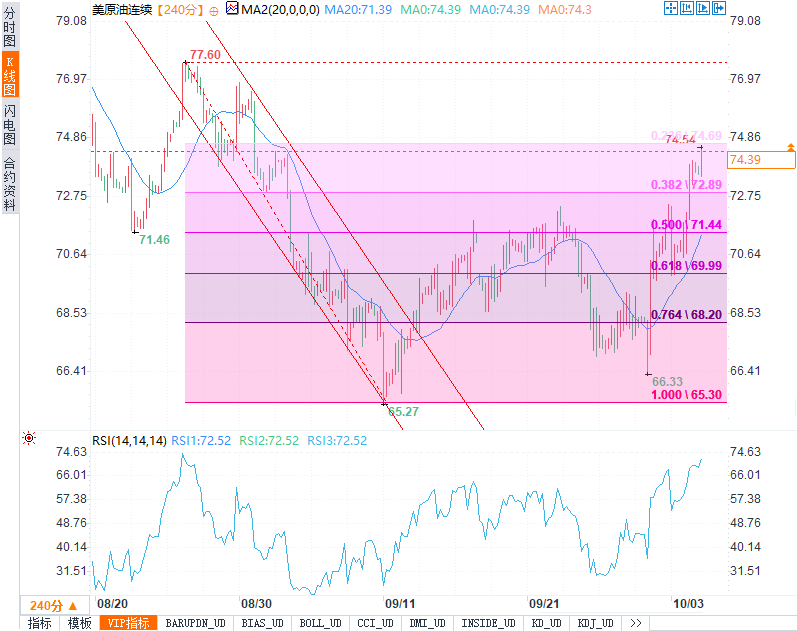 美原油连续合约报74.33美元/桶,涨0.63美元。两种原油在本周均录得8%左右的周涨幅。市场正面临供需面的拉锯,而今晚将发布的9月美国非农就业数据,可能为油价走势带来新的动能。