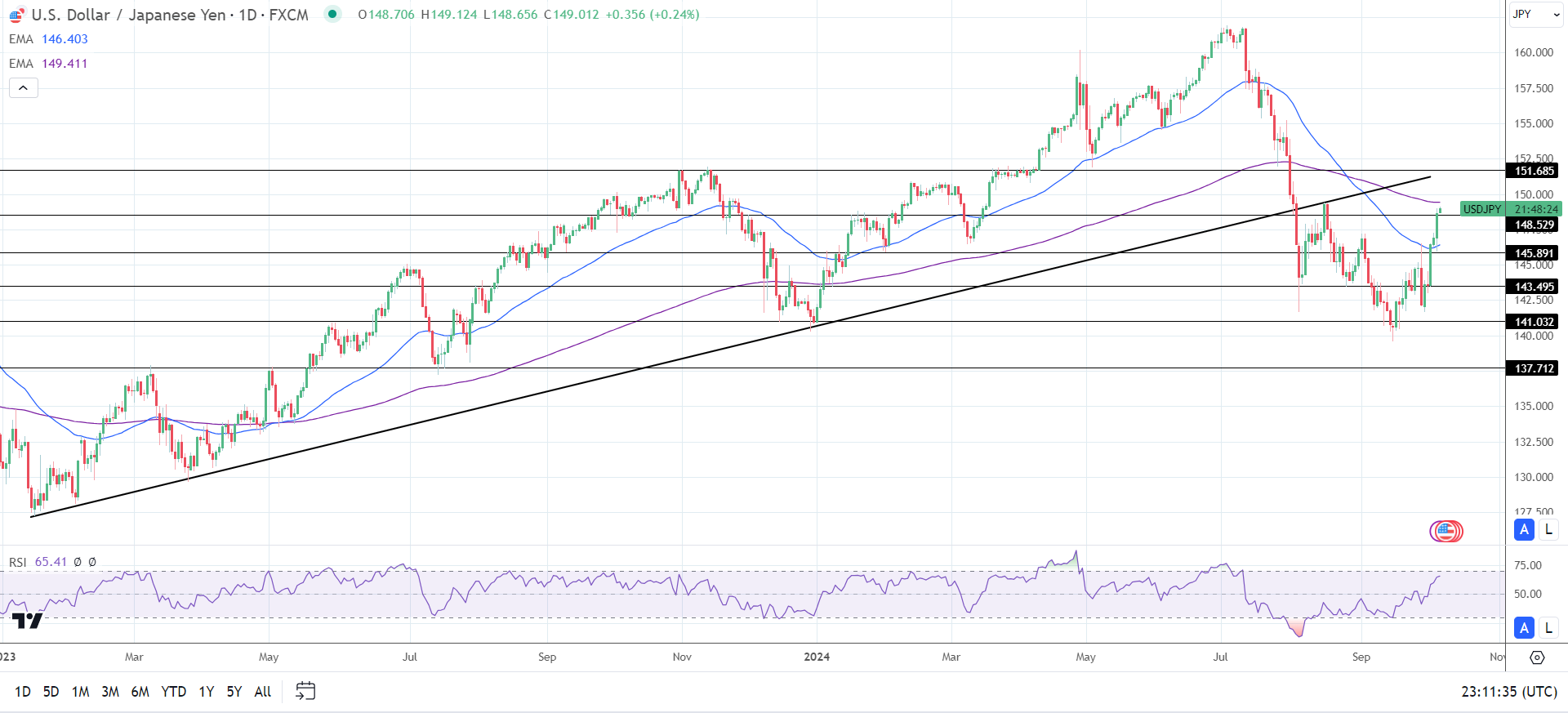 美元/日元突破200日均线将支撑其重返150。此外,突破150可能令多头冲向趋势线和151.685阻力位。