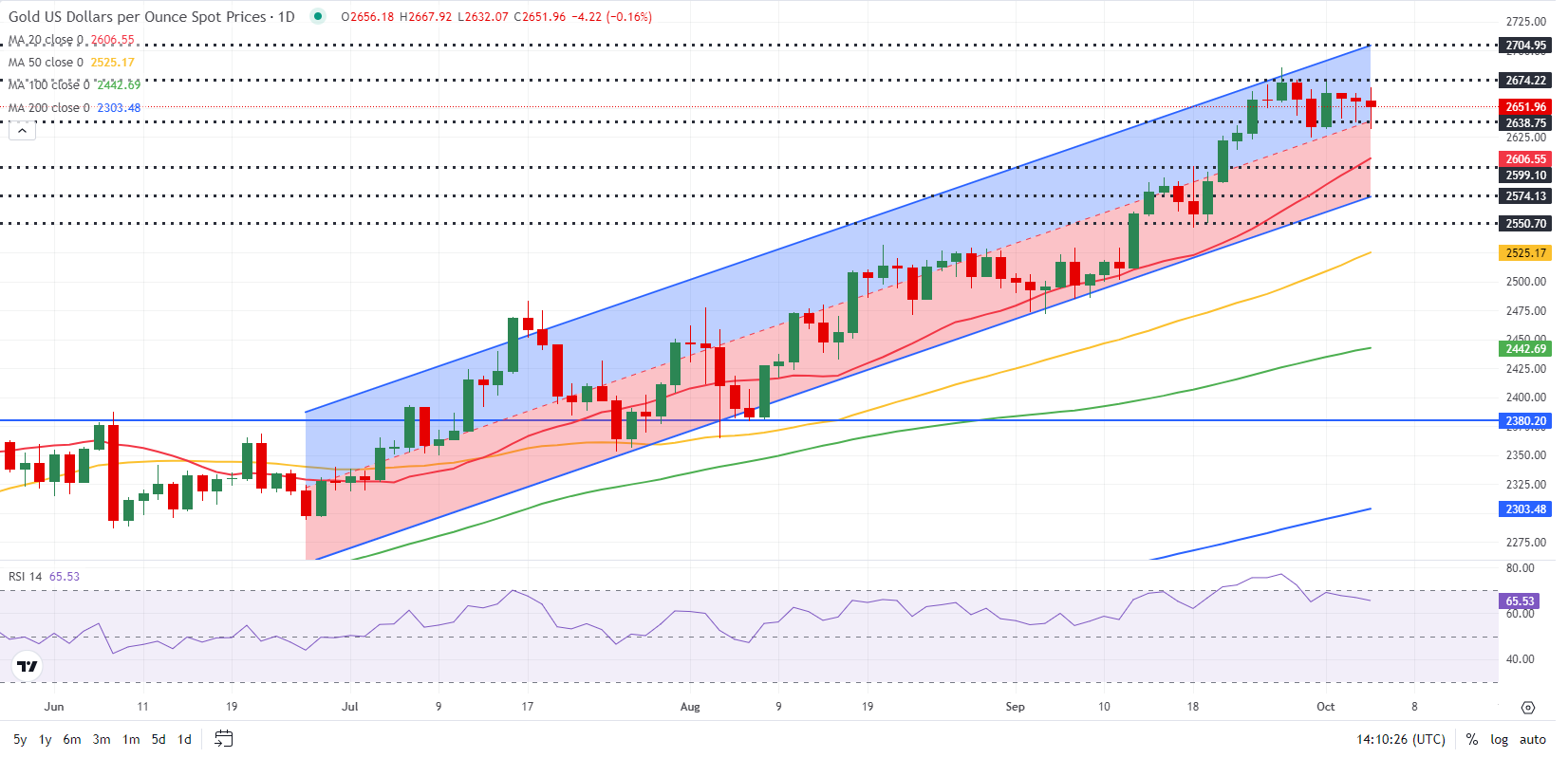 如果金价失守上述水平,下一个支撑位可能在2605-2600美元/盎司(20日简单移动平均线,静态水平),接下来是2575美元/盎司(上升通道的下沿)。