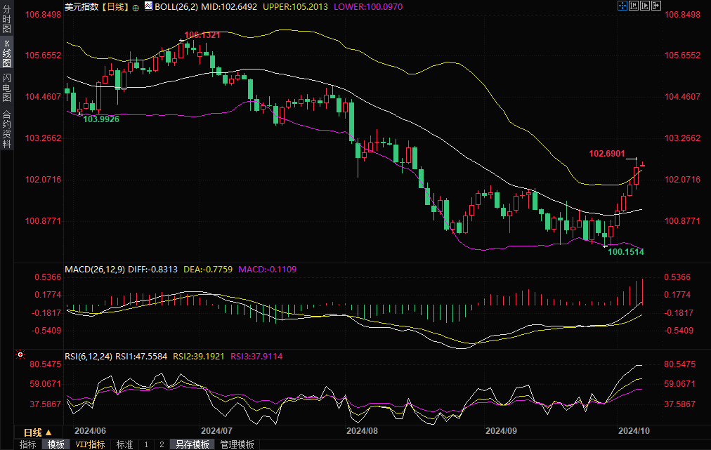 美元指数上周五触及 102.69的 8 月 16 日以来最高,日线录得五连阳,周线上涨2.02%,创下 2022 年 9 月以来的最佳单周百分比涨幅。