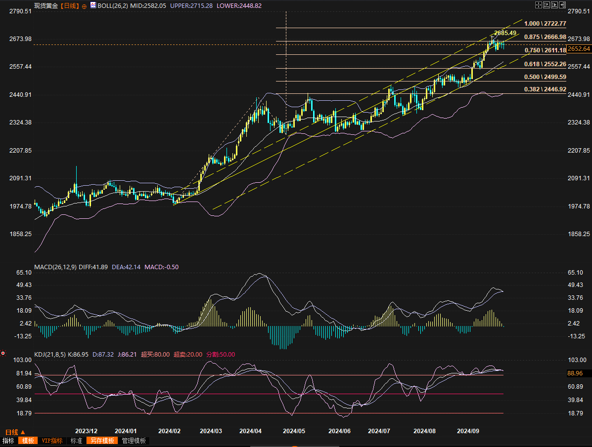 最理想的情况是三次价格误差在1美元之内,当然,两三美元的误差区间也是允许的,即:若本周金价在2627-2623区域(误差范围区域)形成双底,那么“三重底”模式即告成立,多头首先是测2685,然后重点关注2700。如果突破2700,更上方的阻力要看行情的演绎,建议继续关注届时价格对上面日图的黄色虚线及扩展线的测试情况。2720-2722、2750可以关注。