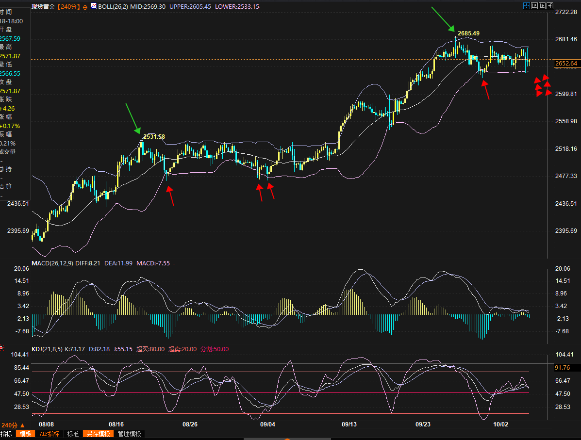复盘一下:上周一(0930)开盘前本人文章提到的这几点得到行情印证:★1)当时预测金价周一开盘后会续涨(金价从2658附近开盘涨到了2666附近);★2)当时预测若金价跌破2643-2439支撑,下方的2634和2625将充当支撑(小时图及以下级别可以清晰看到这两个价位明显充当了支撑,价格触及2634后反弹到2644,且金价在2625附近重启了反弹直至2673附近); ★3)当时预测金价阻力区域2670-2674,其中2674附近将有短线卖压(行情自2673一线震荡下跌到2640-2638区域)。★4)文章当时提醒需要关注超买背离和布林带支撑阻力,实际行情从60分钟图、2H图、4H图上,都能明显看到布林带上中下轨道都提供了支撑阻力作用。(附:当时文章对价格在2643-2439附近形成双底的预测失败,整体行情比预测更疲软一些。)