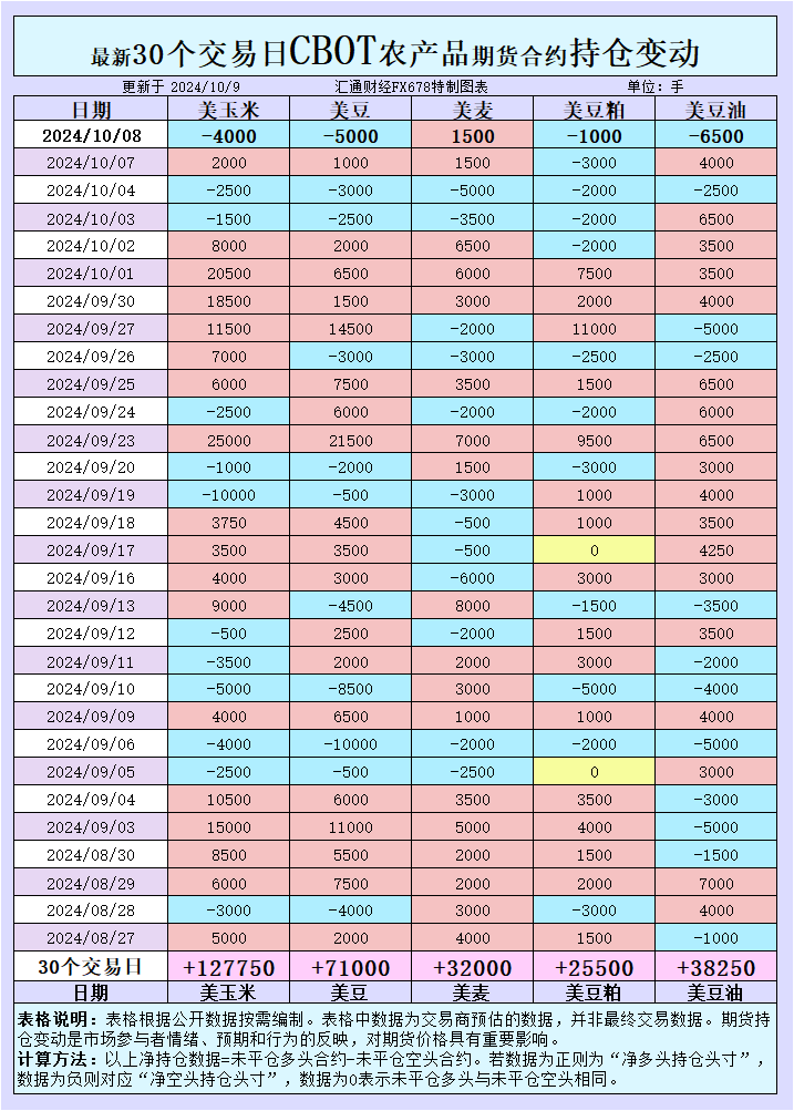 汇通财经APP讯——10月8日,CBOT谷物期货市场表现分化。小麦价格受干旱天气支撑连续上涨,显示出供应紧张的担忧,而大豆和玉米则在丰收预期下承压。大宗商品基金持仓显示,基金对豆类作物的净空头头寸增加,反映出对未来价格走势的谨慎态度。本文将从基本面、技术面和持仓角度出发,分析大豆、豆粕、豆油、小麦和玉米市场的最新变化,揭示市场情绪及未来可能的价格走势。