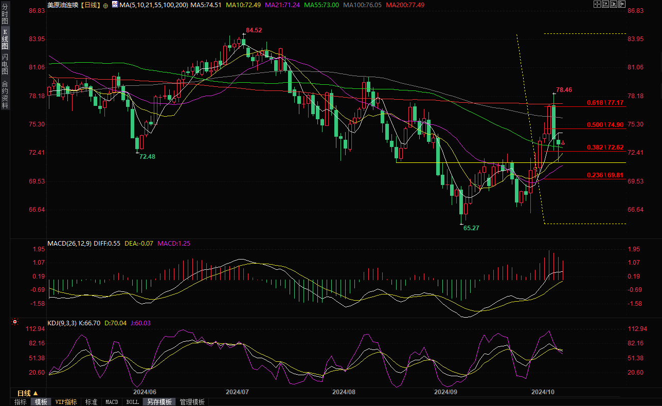 美原油目前交投于73.58美元/桶附近。此前数据显示美国原油库存上升,油价周三盘中一度下跌近3%,触及10日均线位置,但中东冲突导致伊朗供应受扰的风险和美国遭遇飓风米尔顿限制了跌幅。