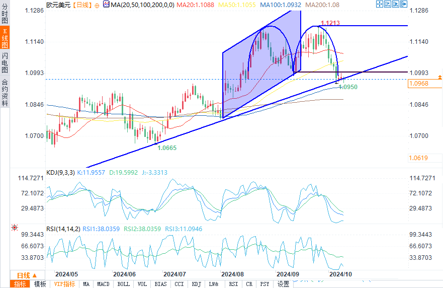 欧元兑美元跌破1.1002的颈线。这个形态的目标在1.08附近。