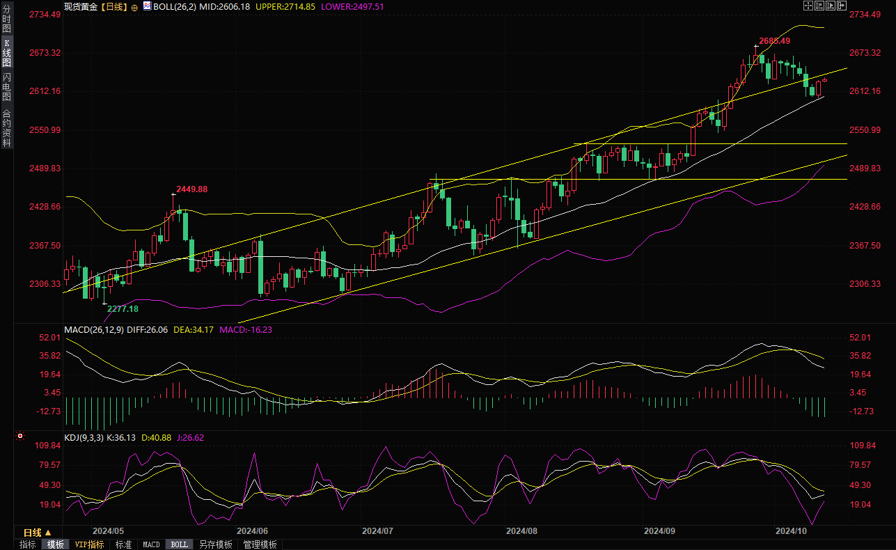 现货黄金小幅走高,目前交投于2633.76美元/盎司,涨幅约0.16%。金价周四震荡走高,在美国CPI数据出炉之际,金价一度下探至2602美元/盎司附近,但市场很快注意到初请失业金数据表现不佳,市场对美联储11月份降息的预期有所升温,金价很快回升至2620上方,随后震荡走高,收报2629.97美元/盎司,涨幅约0.86%,终结了此前六个交易日的回调走势。