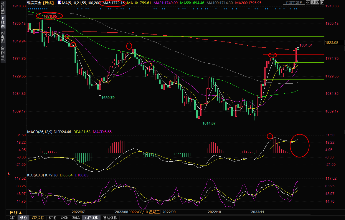不过,隔夜美国PCE数据显示通胀放缓,呼应了美联储主席鲍威尔放缓加息步伐的言论,市场对美联储加息拐点已经到来的预期得到进一步强化,本周ADP等数据暗示美国11月份非农可能表现不佳,市场预期也比较差,基本面偏向多头,金价隔夜顶破11月份高点1786.36附近阻力后,技术面看涨信号也进一步加强,金价后市偏向多头,短线偏向延续涨势或者高位震荡。