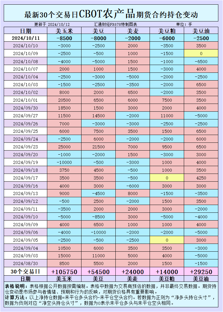 增加CBOT玉米投机性净空头;增加CBOT大豆投机性净空头;增加CBOT小麦投机性净空头;增加CBOT豆粕投机性净空头;增加CBOT豆油投机性净空头。