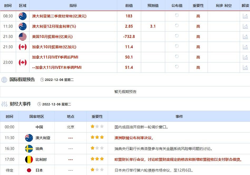 12月5日将举行欧元集团会议,投资者需关注各方官员对于欧元区经济和政策的相关言论,或影响市场未来走势。②12月6日(周二)关键字:澳洲联储公布利率决议,美国10月贸易帐,欧盟财长会议