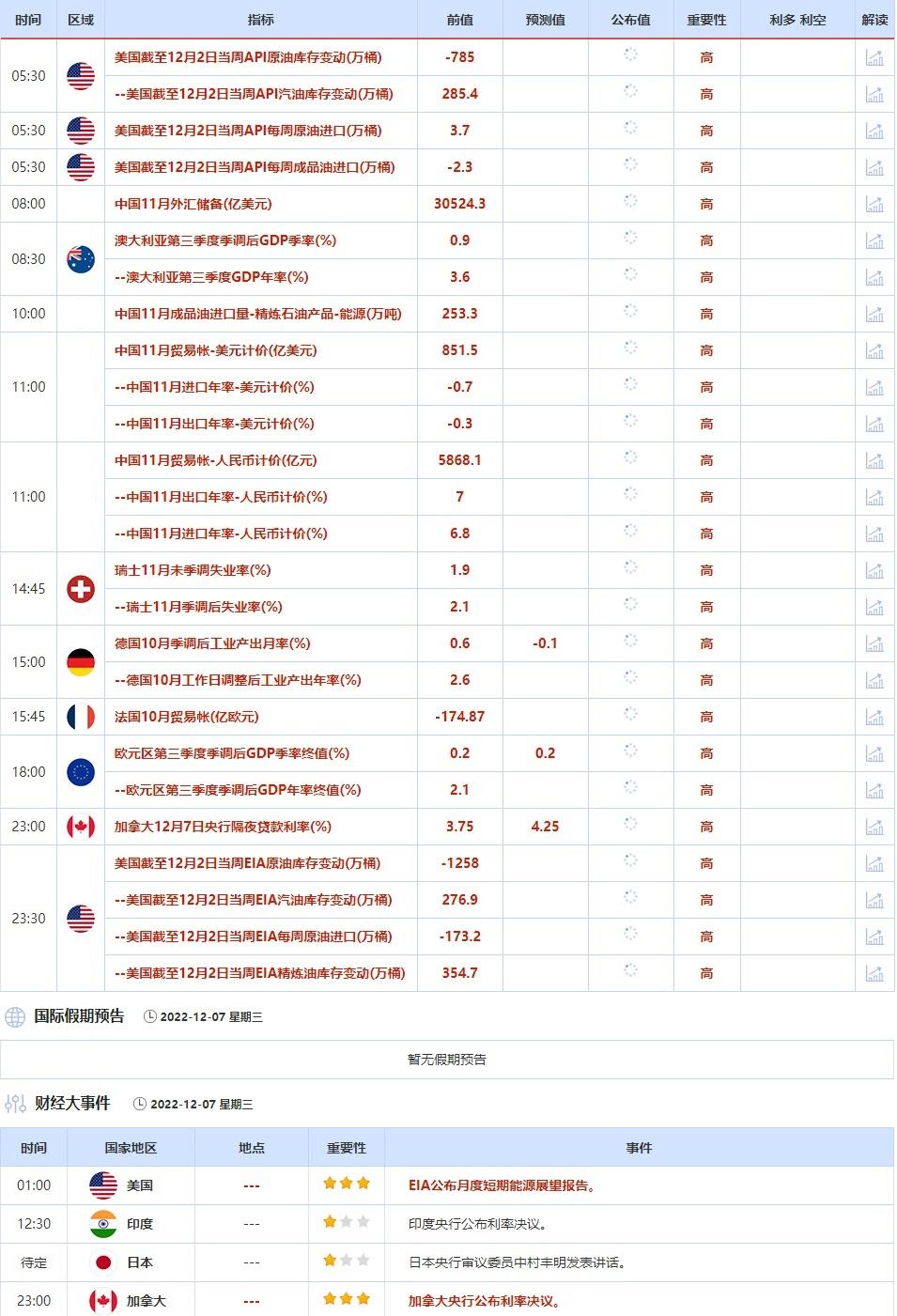 12月6日,欧盟财长将举行会议,讨论欧盟财政规定的修改和新增欧盟税收以支付联合借贷,或影响未来经济发展,投资者也需引起重视。③12月7日(周三)关键字:美国截至12月2日当周API和EIA原油库存变动,加拿大央行公布利率决议