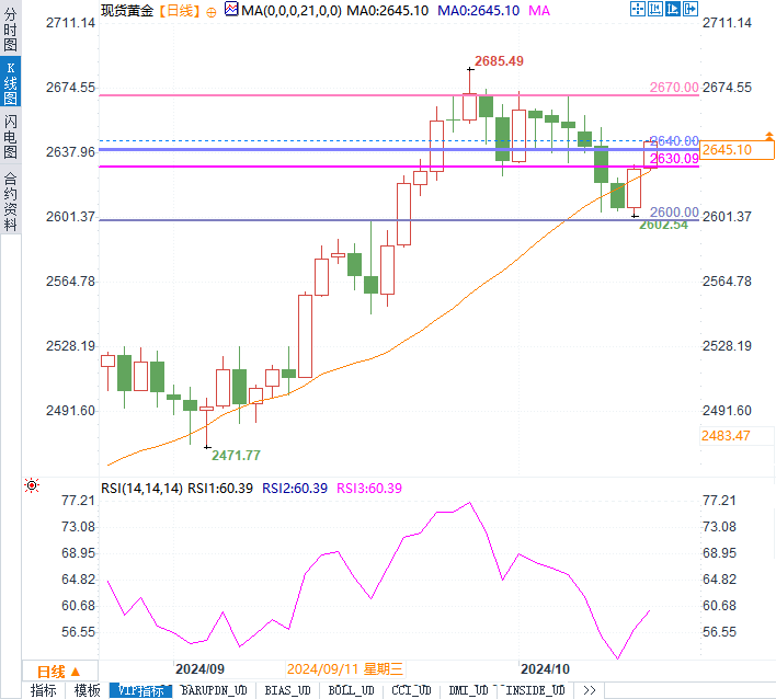 黄金的日内上涨得益于投资者对美联储未来加息步伐预期的变化。虽然近期美国公布的消费者物价指数(CPI)超预期增长,显示通胀压力依然存在,导致市场一度预期美联储可能会放缓降息步伐。然而,随着美国就业市场数据疲软,尤其是上周初请失业金人数意外增加3.3万人至25.8万人,市场再度转向认为美联储将继续逐步降息。这一背景下,金价获得支撑,延续了涨势。