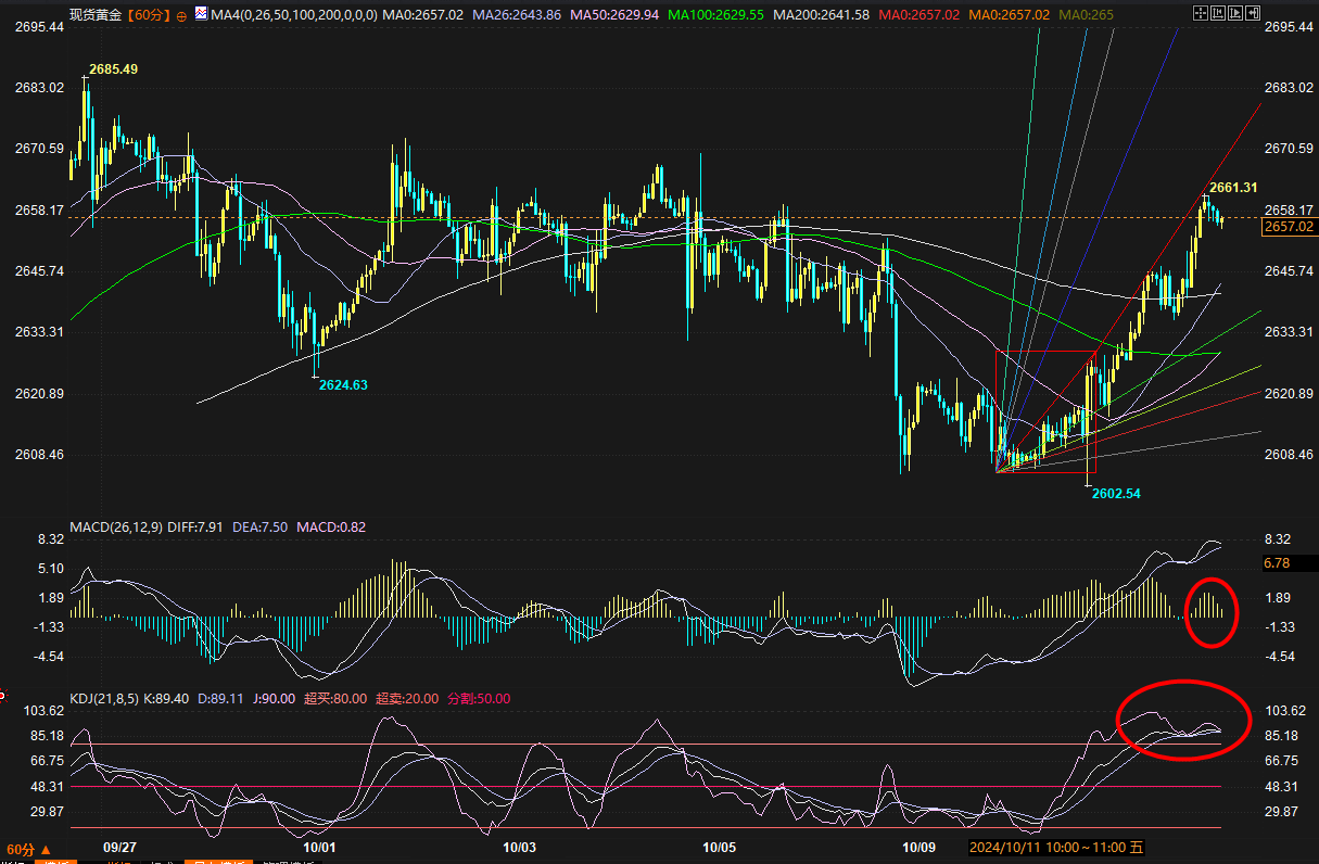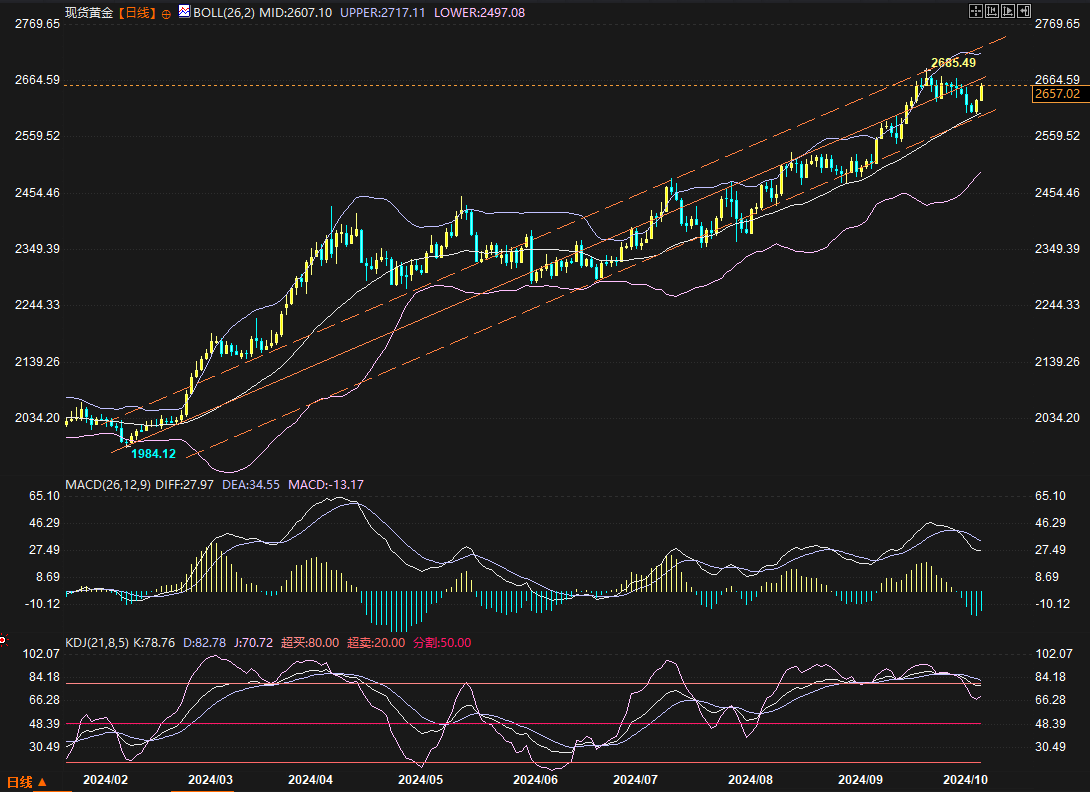 对金价来说,基本面消息在上周被证明是“十分蹩脚的配角”。★1)上周二1008晚间的美国贸易帐赤字幅度低于预期,利好美元利空黄金,金价从2652启动下跌一直跌至2604才止跌,这里其实不能说是美国贸易帐数据的威力有多大,而是看跌趋势中反弹的黄金来到了阻力位,美国贸易帐数据只是压垮骆驼的一根稻草,起到触发启动的作用。因为发布的数据与预期并没相差多少,而且依然是大幅赤字。★2)中东局势依然各种不太平,但上周文章我们说过,在没有站稳支撑之前,这种地缘局势的利好不能在金价上得到体现。★3)更讽刺的是,上周四1010凌晨的美联储纪要,被解读为令市场对美联储“11月不降息的预期升温”,这理论上利空金价,但金价仅从2610跌到2605附近,之后很快站稳支撑并启动上涨行情,最高到2653.37美元/盎司并守住大部分涨幅。