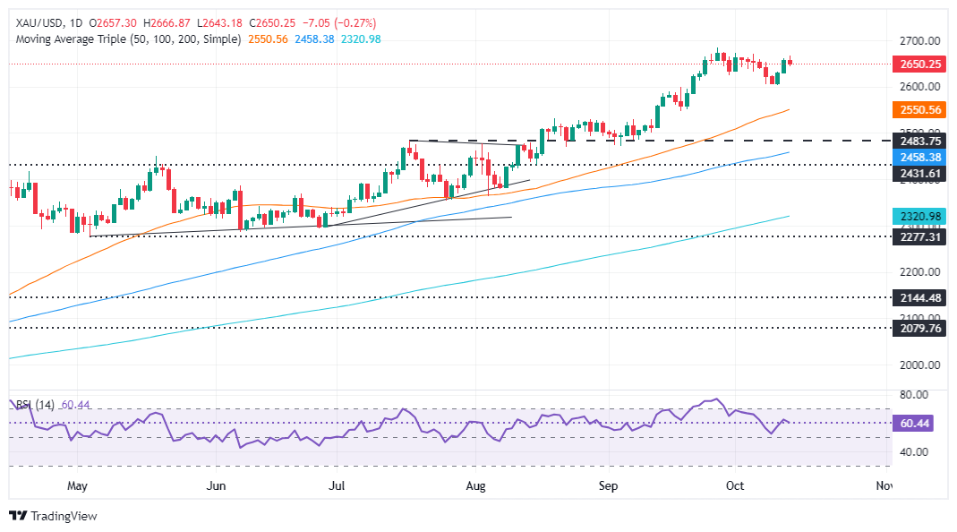 FXStreet分析师Christian Borjon Valencia指出,尽管金价从2660美元/盎司附近回落至2650美元/盎司区域,但上行趋势仍保持不变。势头看涨,正如相对强弱指数(RSI)所显示的那样,不过RSI略有下降,这表明一些抛售压力仍然存在。