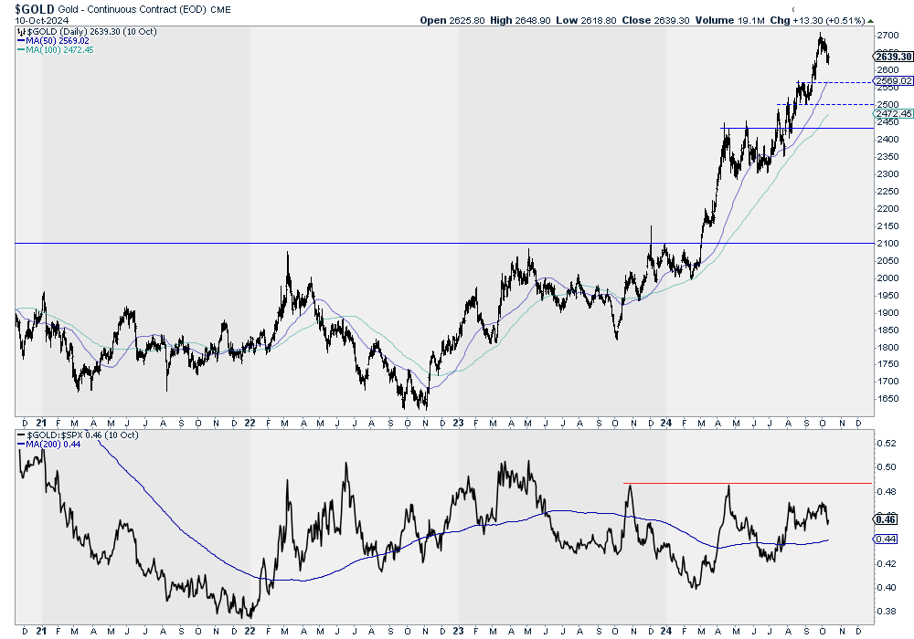 更紧迫的问题是黄金与标准普尔500指数之比的负背离,自金价再次上涨10%以来,该比率创下了较低的高点。