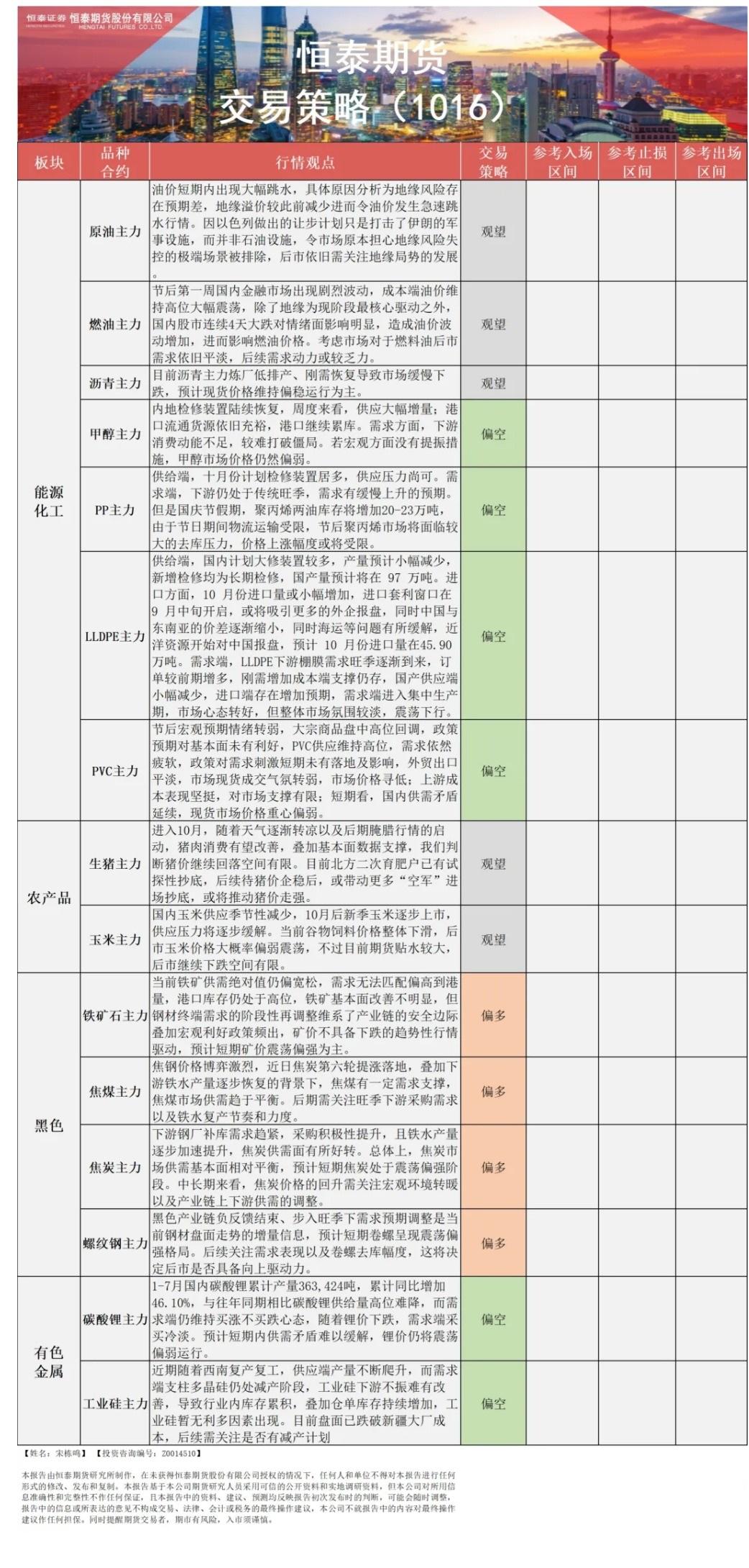 标题:【恒泰早报】10月16日恒泰期货交易策略