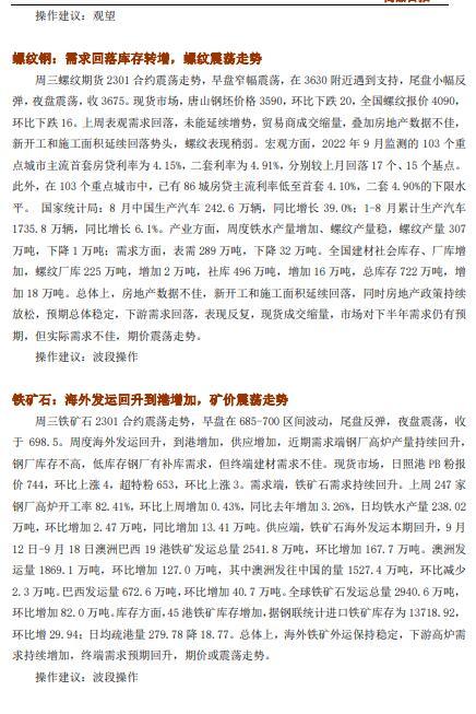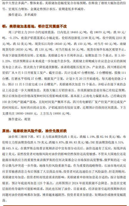 油价周三继续下跌。WTI 主力原油期货收跌 1 美元,跌幅 1.19%,报 82.94 美元/桶;布伦特主力原油期货收跌 0.79 美元,跌幅 0.87%,报 89.83 美元/桶;INE 原油期货收涨 0.51%,报 645.9 元。在俄罗斯总统普京视频讲话中宣布部分动员后,油价迅速有了反应,短线冲高超 2 美元,显然投资者对地缘风险对油价的影响仍然保持这高度敏感,不管从大国地位还是能源市场供应方的重要性来讲俄罗斯的任何决策都会让市场保持高度警惕,俄罗斯的这一动作让俄乌冲突进一步升级,地缘失控风险重新升温,作为重要的战略物资,石油市场对此反应非常敏感消息公布后领涨了大宗商品市场,投资者对此迅速给出了风险溢价。但是到晚间,美联储宣布加息,投资者转而忧虑需求的影响。美联储重申持续加息是合适的;按计划推进缩表。预计年底前再加息 125 个基点;点阵图预测2024 年前美联储不会降息。加息在宏观层面的传导最终可能影响需求,因此也压制了油价。目前来看,经济前景引起的预期和供应问题对油价的影响都在加强,博弈越来越剧烈,投资者需多加留意。短期油价或继续宽幅震荡。