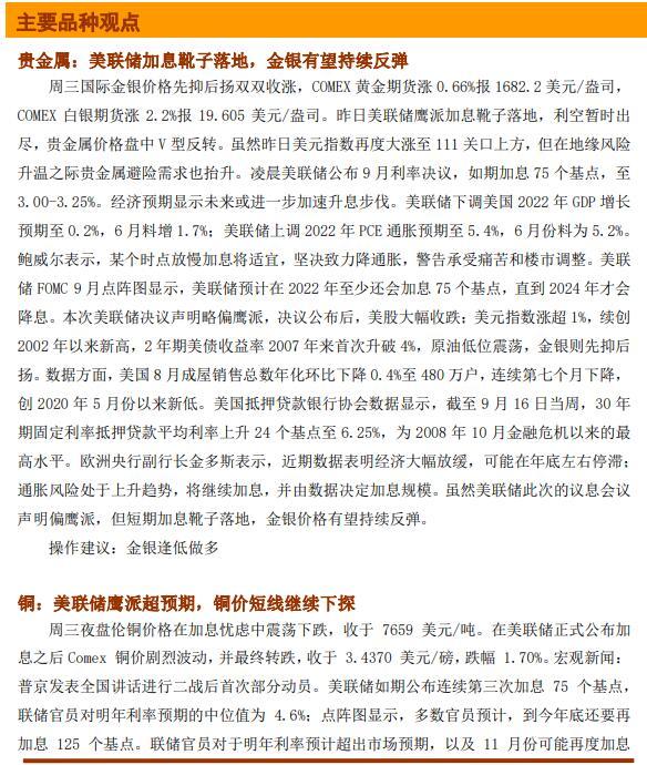 美元指数再度大涨至 111 关口上方,但在地缘风险升温之际贵金属避险需求也抬升。凌晨美联储公布 9 月利率决议,如期加息 75 个基点,至3.00-3.25%。经济预期显示未来或进一步加速升息步伐。美联储下调美国 2022 年 GDP 增长预期至 0.2%,6 月料增 1.7%;美联储上调 2022 年 PCE 通胀预期至 5.4%,6 月份料为 5.2%。鲍威尔表示,某个时点放慢加息将适宜,坚决致力降通胀,警告承受痛苦和楼市调整。美联储 FOMC 9 月点阵图显示,美联储预计在 2022 年至少还会加息 75 个基点,直到 2024 年才会降息。本次美联储决议声明略偏鹰派,决议公布后,美股大幅收跌;