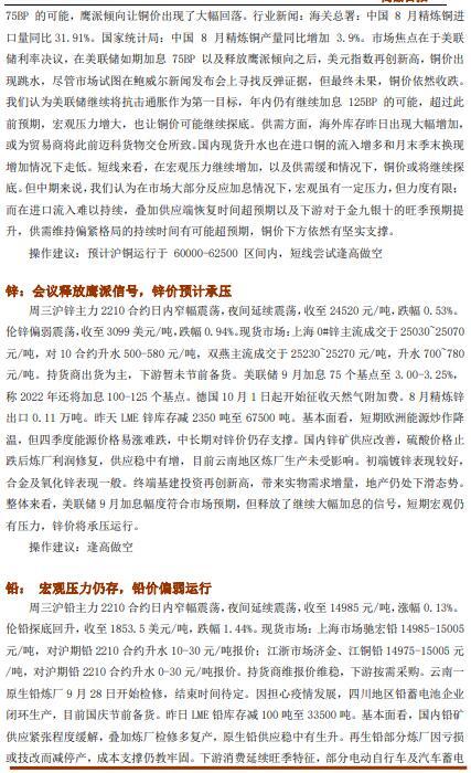 美元指数再创新高,铜价出现跳水,尽管市场试图在鲍威尔新闻发布会上寻找反弹证据,但最终未果,铜价依然收跌。我们认为美联储继续将抗击通胀作为第一目标,年内仍有继续加息 125BP 的可能,超过此前预期,宏观压力增大,也让铜价可能继续探底。供需方面,海外库存昨日出现大幅增加,或为贸易商将此前迈科货物交仓所致。国内现货升水也在进口铜的流入增多和月末季末换现增加情况下走低。短线来看,在宏观压力继续增加,以及供需缓和情况下,铜价或将继续探底。但中期来说,我们认为在市场大部分反应加息情况下,宏观虽有一定压力,但力度有限;而在进口流入难以持续,叠加供应端恢复时间超预期以及下游对于金九银十的旺季预期提升,供需维持偏紧格局的持续时间有可能超预期,铜价下方依然有坚实支撑。