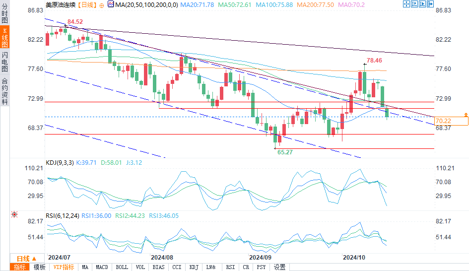市场预测:前景看跌由于技术指标显示油价有进一步下行的潜力,而且欧佩克和国际能源署都预计需求将走弱,原油价格的市场前景堪忧。供应担忧缓解,加上全球需求走弱,表明油价可能会继续下跌,短期内可能会试探每桶66美元至64美元的支撑位。交易者应该关注进一步的下行势头,尤其是在关键支撑位被突破的情况下。