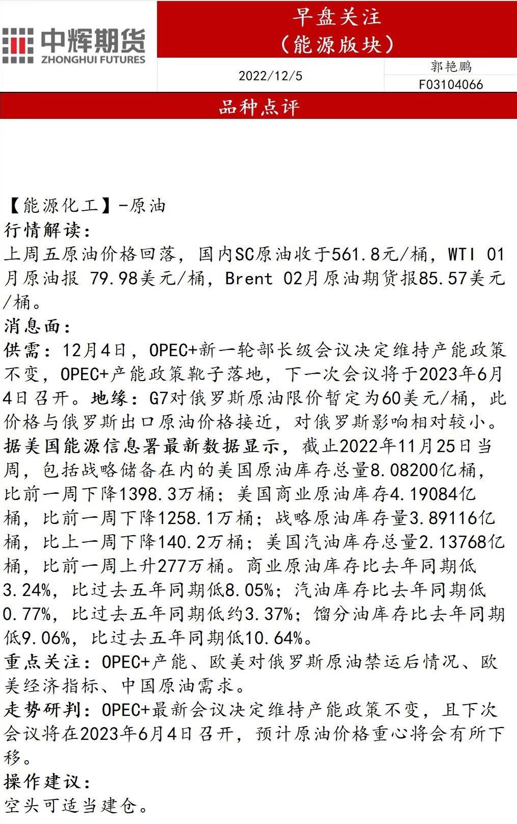 中辉期货能源早盘关注:原油价格重心将会有所下移,空头可适当建仓