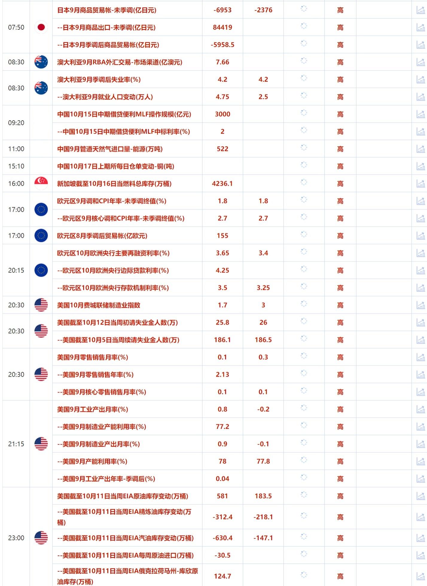 汇通财经APP讯——以下是周四( 10月17日)财经早餐,包括基本面重要消息、贵金属/原油/外汇/商品/股市/债市等行情、国际要闻、国内要闻、机构观点、今日财经重要数据及财经大事。OPEC下调了今明两年的石油需求增长预测影响持续,国际油价继续下跌。以色列或在11月5日前报复伊朗,中东紧张局势恐升级。瑞银警告,在下届美国政府确定之前,黄金市场的不确定性和波动性将会上升。