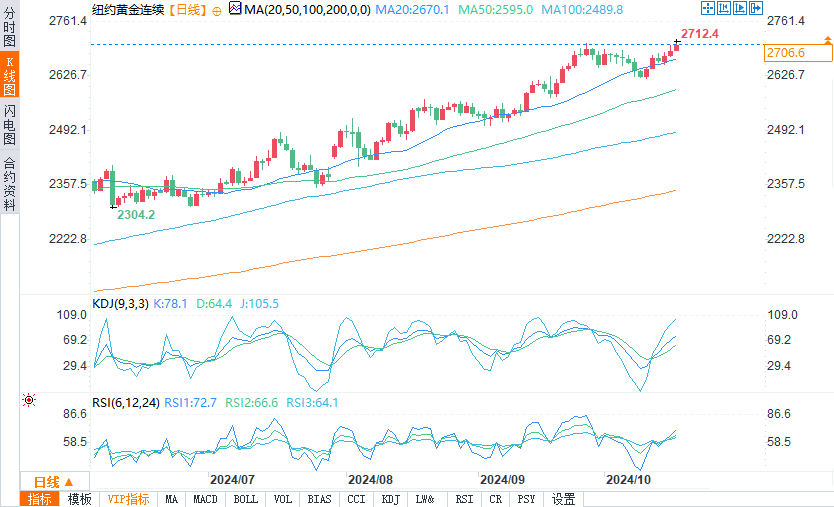 COMEX黄金期货报2706.3美元/盎司,涨幅0.56%。