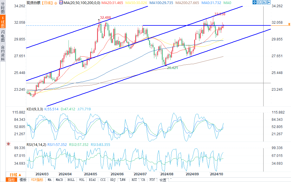 价格小幅上升,仍低于10月4日的主高点32.96美元。然而,金价近期飙升至历史高点,令白银交易商保持高度警惕,密切关注潜在的溢出效应,这可能推动银价升至34.35美元的多年高点。