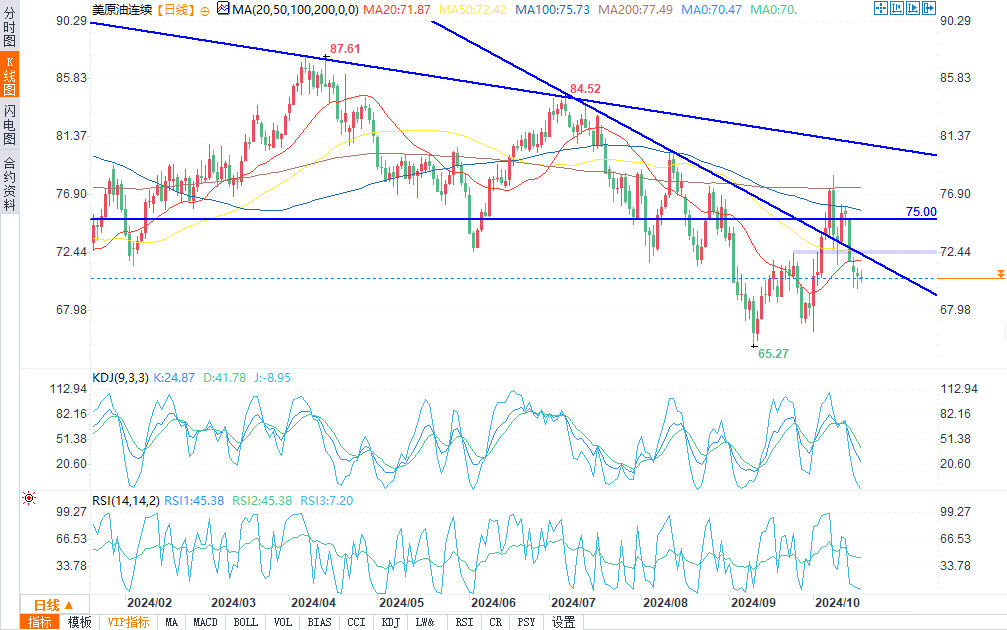 汇通财经APP讯——周四(10月17日)欧盘时段,WTI原油期货价格平稳微涨,市场趋势仍看跌。价格目前低于50日移动均线(72.42美元)和200日移动均线(77.49美元),表明中期和长期趋势均疲弱。