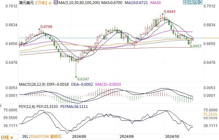 中国银行广东省分行王刚称,周四美日盘中一度穿破150关口去到150.32,最终纽约盘尾上涨0.4%,收盘报150.24 。美国数据显示经济保持韧性,增强了人们对美联储将在未来一年半内以较小步伐降息的预期。当天欧银降息更是助长了美元的强势。澳美稍有反弹,纽约盘尾上涨0.4%,报0.6702美元。澳洲9月就业数据好于预期,年底降息的希望破灭,息差方面将有可能令澳元占据着优势地位。