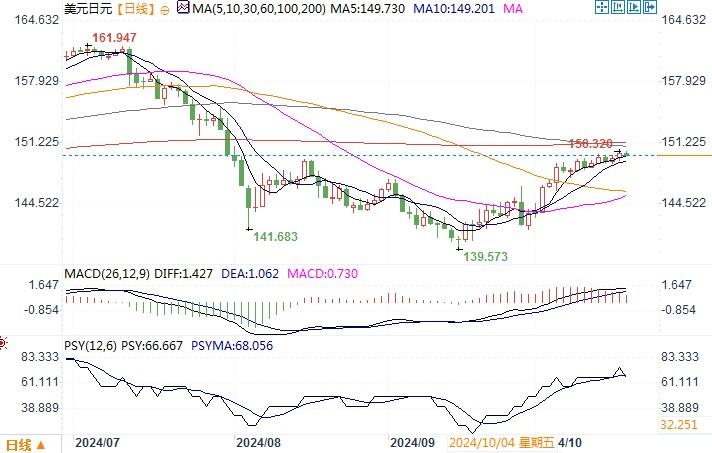 盘中一度穿破150关口去到150.32,为8月1日以来首次,最终纽约盘尾上涨0.4%,收盘报150.24 。周四数据显示,9月美国零售销售增长0.4%,8月增幅确认为0.1%。接受路透调查的经济学家此前预测9月零售销售将增长0.3%。劳工部的一份报告显示,上周初请州政府失业金的人数减少1.9万人,经季节性因素调整后为24.1万人,但飓风和波音长达一个月的罢工 ,使得清晰解读劳动力市场变得更加困难。数据显示全球最大经济体依然保持着韧性,增强了人们对美联储将在未来一年半内以较小步伐降息的预期。与此同时,周四当天欧央行如预期般率先继续降息25个基点至3.25%,市场预计12月还将降息25个基点。欧央行的举动更是助长了美元的强势。此外,博彩网站Polymarket显示,特朗普在11月美国总统大选中获胜的几率正在增加。Moneycorp的Epstein称:“特朗普获胜的几率增加,因此所谓的'特朗普交易'(即买入美元)又回来了。”目前市场上充斥着较多对日元不利的影响,日元弱势局面恐要延续。日内留意日本的CPI数据情况。若数据显示通胀增长较快,或将提高日本央行加息的预期,这有助于舒缓日元近期的走弱势头。否则,日元暂时难以提起多头交易的兴趣。日线图上,美元/日元整体偏于上行。而一旦汇价坠落147之下,则可能预示美元上行将告一段落。