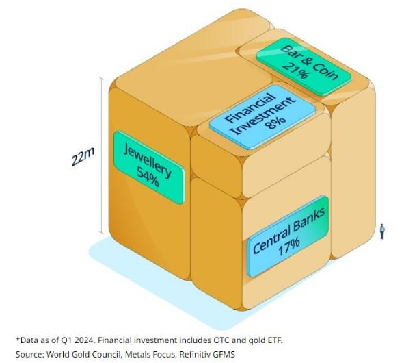 图:地上黄金存量立方体显示各行业的黄金需求占比(截止今年第一季度,金融投资包括场外和黄金ETF)