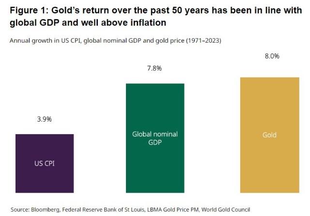 报告称:“在大多数情况下,这些理论的预期长期实际回报率在0%至1%之间。”“相反,我们表明,黄金的长期回报率在过去50多年里一直远高于通胀,更接近地反映了全球GDP,这是我们其他黄金定价模型中使用的经济扩张驱动因素的代表。”