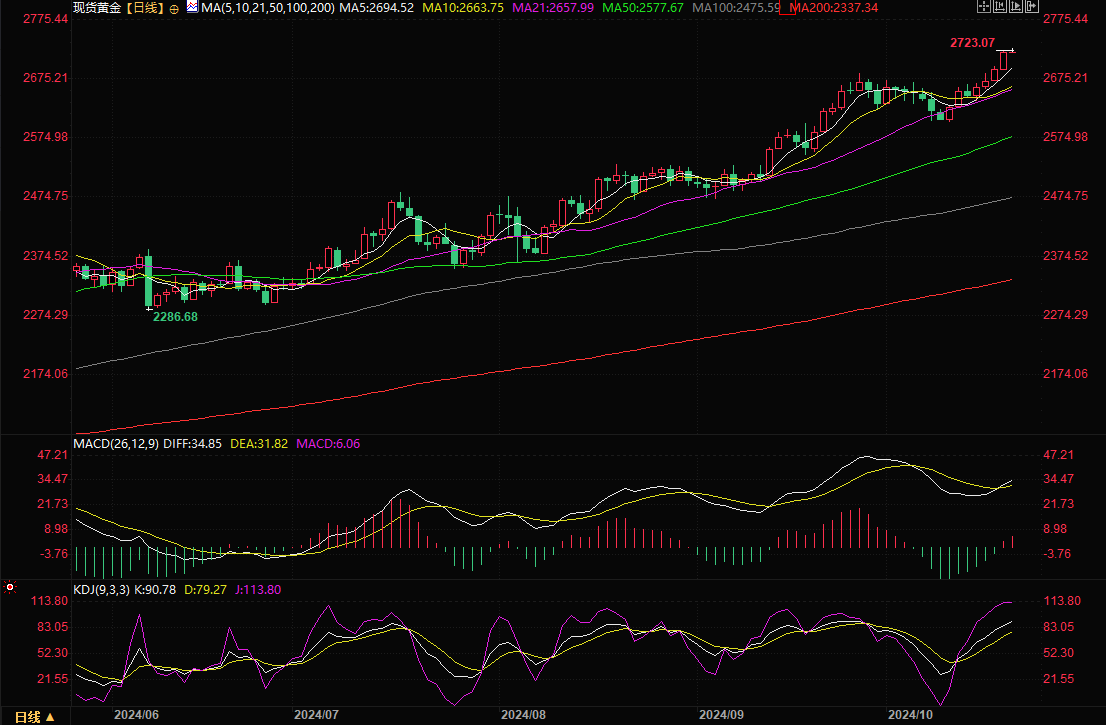 现货黄金小幅冲高,最高触及2723.07美元/盎司,再度刷新历史高点。金价上周五升穿每盎司2700美元大关,收报2722.13美元/盎司,为史上首次,受助于中东紧张局势升级、美国大选的不确定性以及宽松货币政策预期,金价上周累计上涨2.45%。