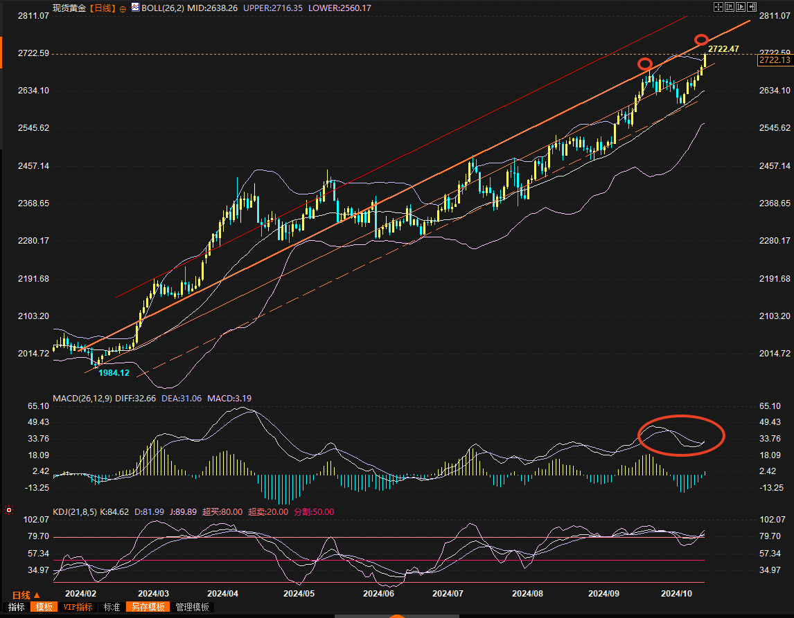 汇通财经APP讯——上周(1014-1018当周),金价涨约84美元周线近乎光头大阳线,超买和狂热在齐头奔跑。
