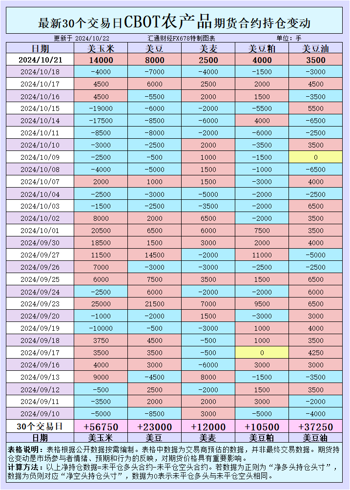 汇通财经APP讯——全球谷物及油籽市场在10月21日的交易日后,迎来了多项新的基本面变化,特别是在大豆、小麦和玉米市场上,CBOT持仓变化与国际招标动态影响了市场情绪,并为未来的价格走势带来了不确定性。在此背景下,我们分析各品种的最新行情和背后驱动因素。