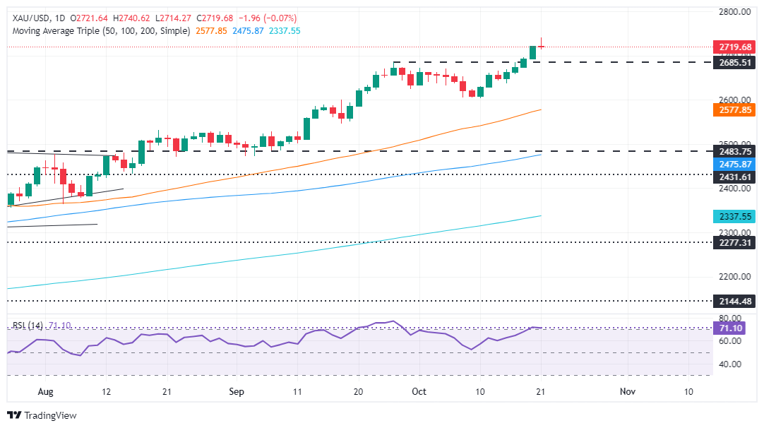 截至周一收盘,现货黄金下跌约0.1%,报2719.49美元/盎司。