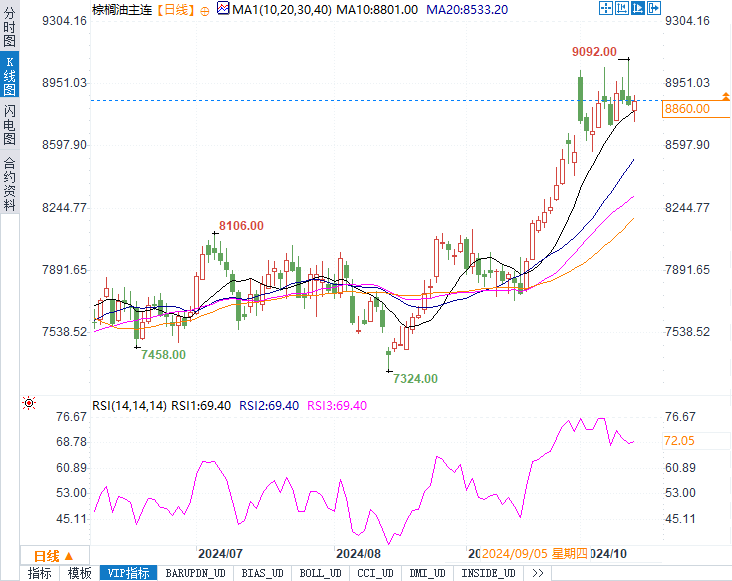 总体来看,尽管棕榈油市场面临一些不确定性因素,但出口需求的强劲和产量的季节性下降为价格提供了支撑。未来几周,市场将继续关注出口数据和产量变化,以判断价格走势。