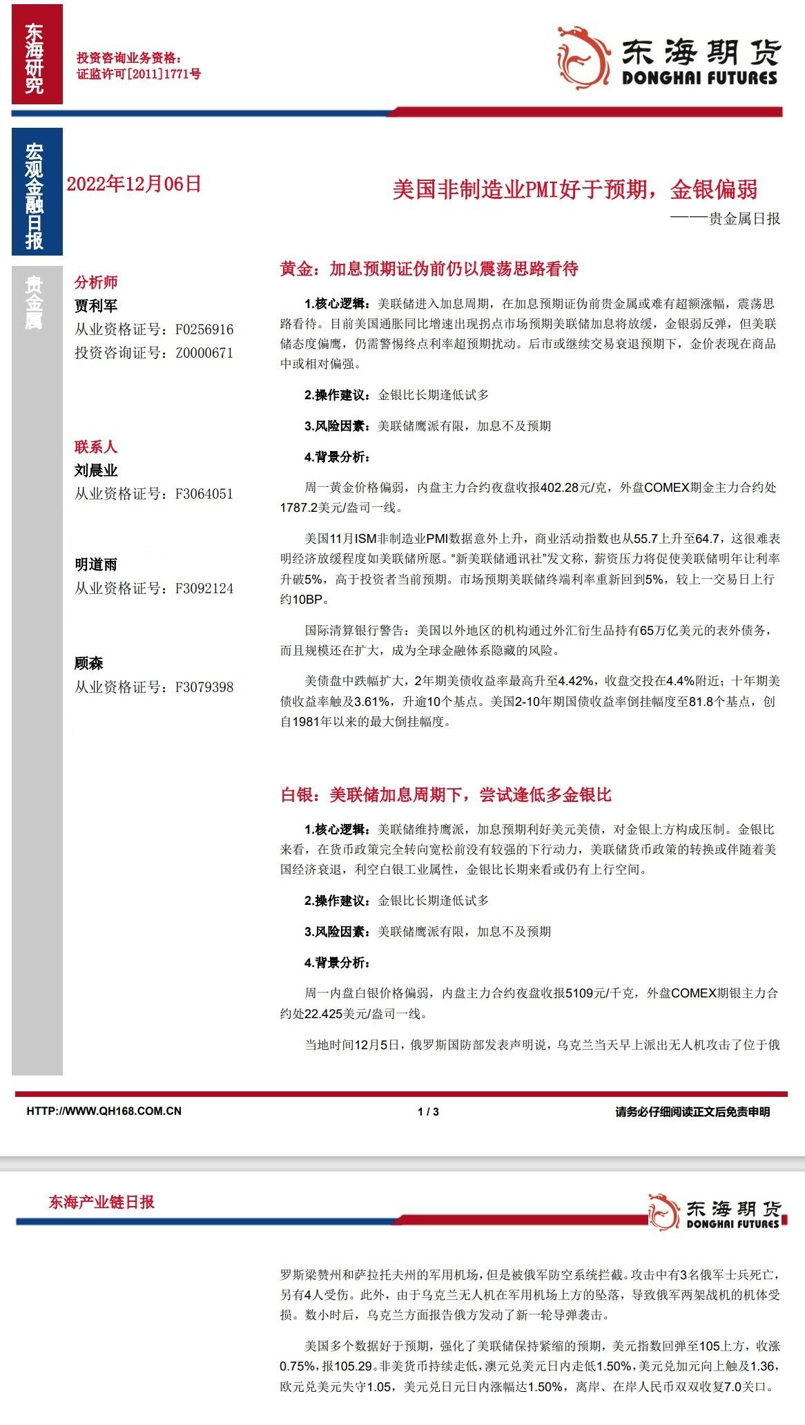 标题:【东海期货12月6日产业链日报】贵金属篇:美国非制造业PMI好于预期,金银偏弱