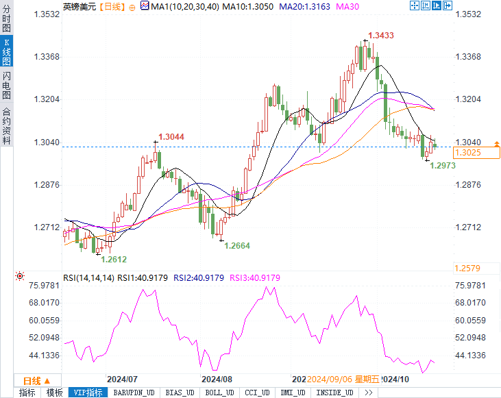 英镑兑美元今日下跌0.2%,报1.3022美元。英镑走势与英国债券收益率紧密相关,特别是在近期英国通胀数据低迷的情况下,英镑承压下行。此外,市场对英国财政大臣里夫斯将于10月30日公布预算案的预期,也令英镑面临更多不确定性。