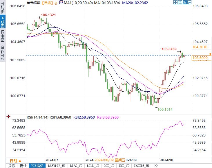 距离美国总统大选仅剩15天,市场对政治不确定性的反应逐渐升温。最新的民调显示,特朗普胜选的可能性有所上升,这为美元提供了额外支持。市场普遍认为,特朗普胜选将带来更为积极的贸易政策和关税措施,这可能进一步推动美元走高。