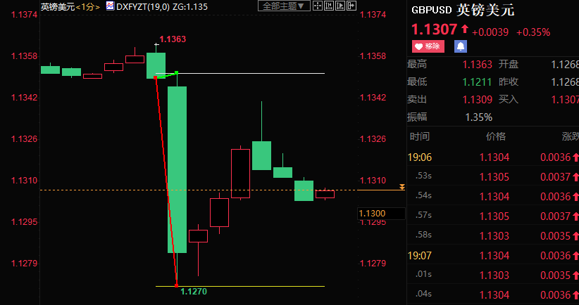 英镑兑美元跳水80点至1.1270后收复半数失地。