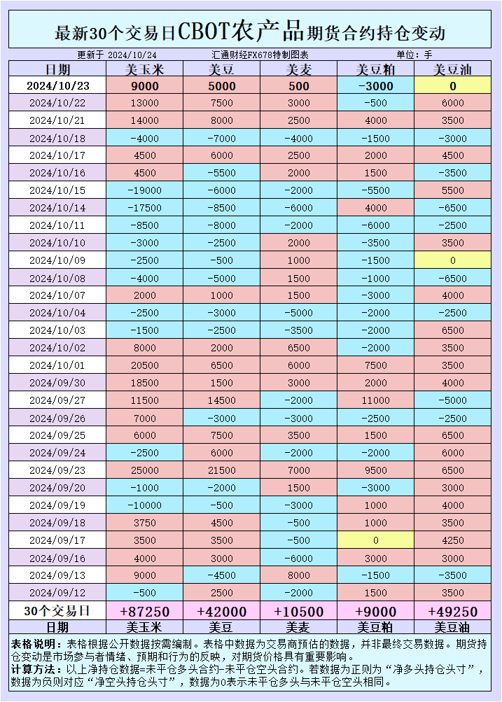 美国农业部报告称,截至10月17日的一周内,预计豆粕出口销售量在150,000至350,000吨之间,这为未来豆粕价格提供了一定的支撑。然而,当前的市场反应却表现为商品基金减少了CBOT豆粕的净多头持仓,这可能反映了市场对短期价格承压的预期。