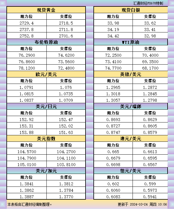 10月24日亚市支撑阻力:金银原油+美元指数等六大货币对